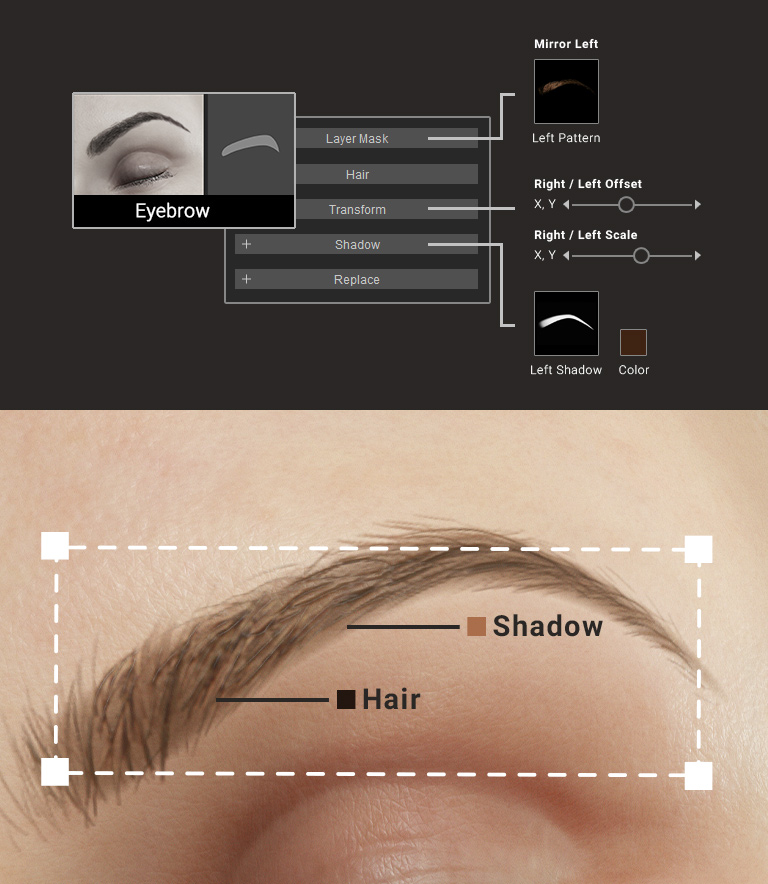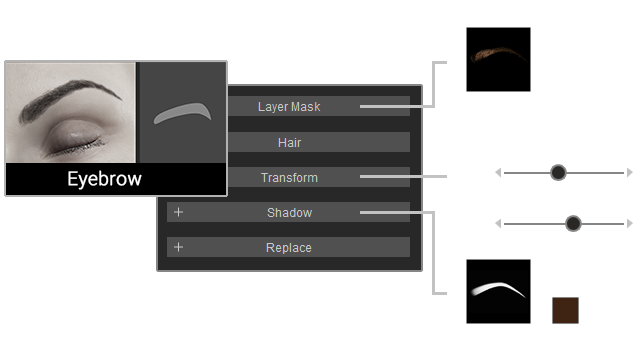 Eyebrow tool is designed for realism with hair and shadow layers. Only one colored eyebrow image is needed and the other side is automatically projected. You can apply an alpha range map for the shape of the shadows and then adjust the colors. Adjustments in the Transform section allows you to move the eyebrows to the ideal position. Import a scanned character, and use Replace to cover the original eyebrows with this tool.