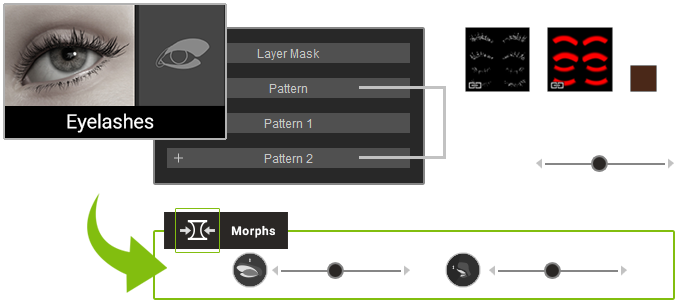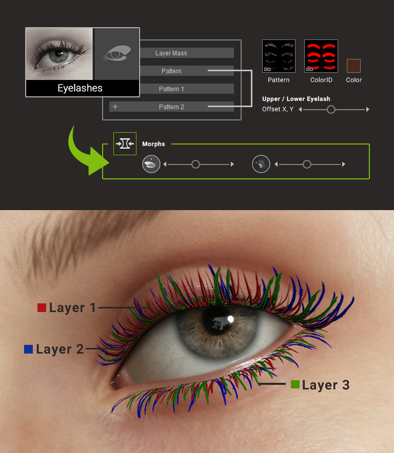 Eyelashes are composed of fine hairs around the eyes that require delicate blending. To achieve a delicate balance, the Eyelash tool provides three eyelash layers and two color adjustments per layer. You can create eyelashes of different density and color blending. The style of eyelashes can be changed by applying an alpha graphic and a colorID range map for each layer. Use the morph sliders to change the length and shape of the lashes.