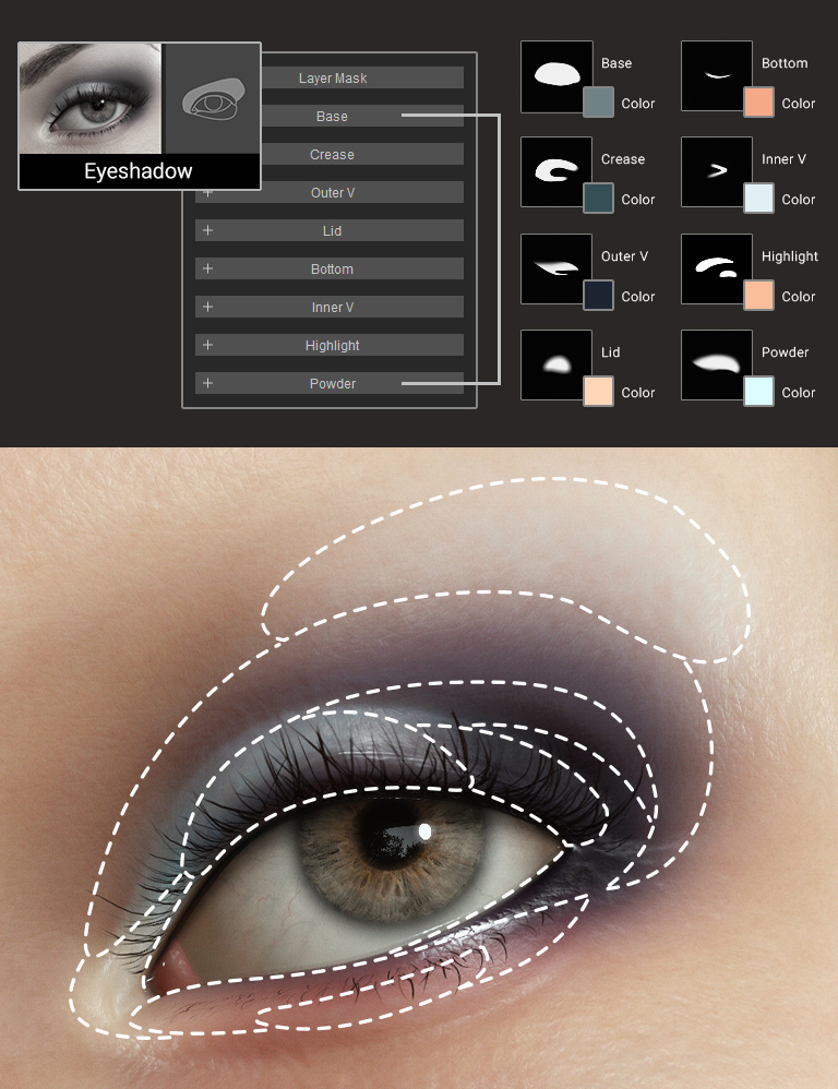 Our highly versatile eyeshadow makeup effect supports seven distinct sections, each supporting its own unique alpha range. Utilize adjustable colors, blur, and powder adjustments to achieve a look you desire and power your way through the fashion catwalk!