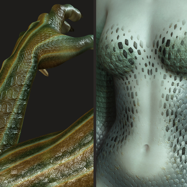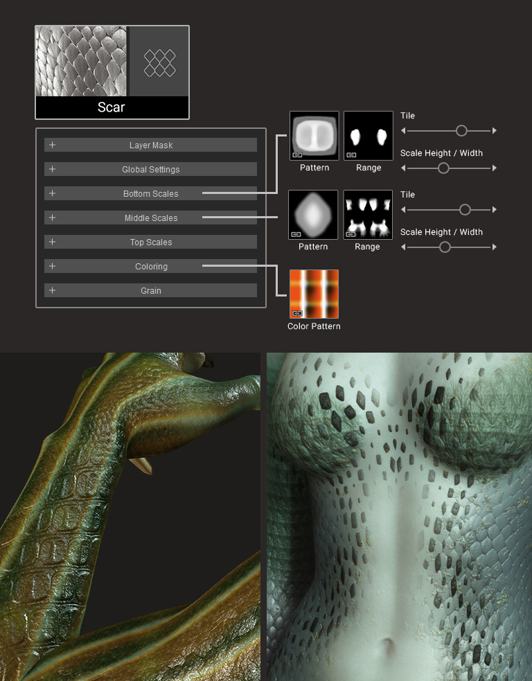 Create an amphibious look for your character, ranging from animals found in nature such as snakes to totally alien appearances. Or recreate looks from movies and fantasy settings like Mystique in the X-men series. Apply three alpha patterns and alpha range images for each of the three sections and freely deploy multiple Transform modifications.