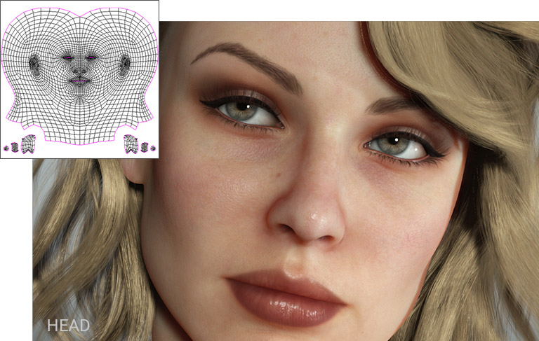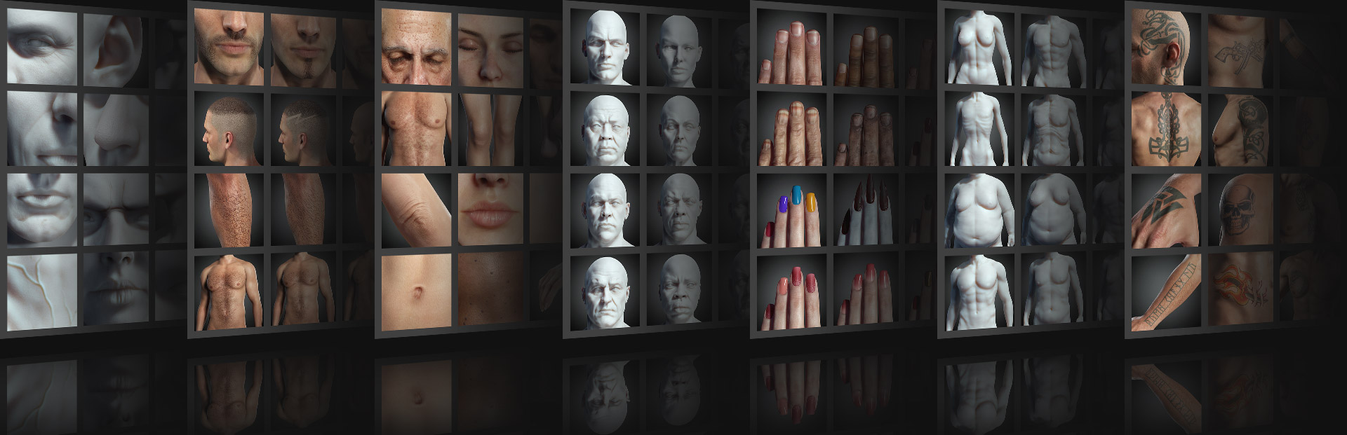 Access a whole new range of highly realistic, dynamic skin assets ranging from full-body skin presets to individual material effects. Customize the look with muscles, wrinkles, pores, color variation, scalp, body hair, nails, blemishes, and acne; overlay effects with acquired art from imported images for suntan, wounds, scars, tattoos and more.