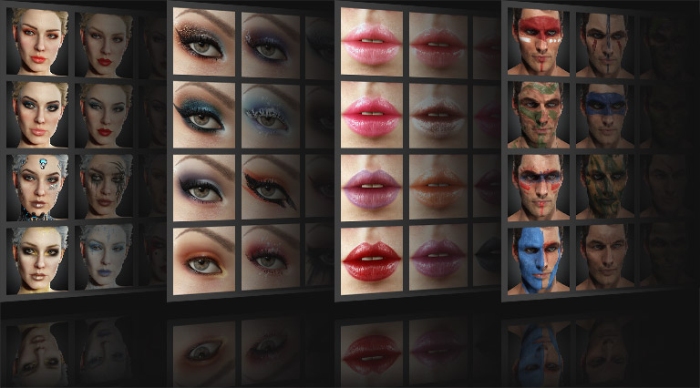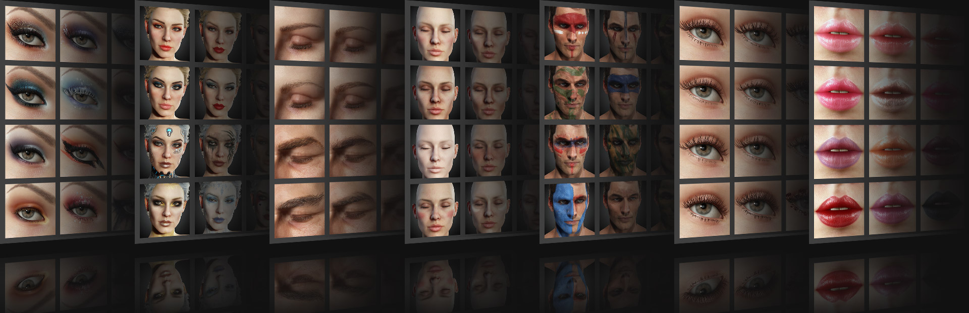Access to a whole new line of dynamic makeup assets from Content Library, ranging from full makeup presets to part effects, which include foundation, eyebrow, eyeshadow, eyeliner, lips and war paint. Morphable eyelash options are also included.