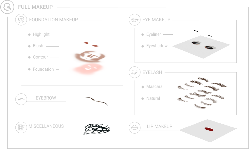 The makeup content types are designed based on practical cosmetic and effects makeup theory, from foundation, blush, to brows, eyes, eyelash, and lips . Makeup effects can be applied and editing at anytime during the design process.