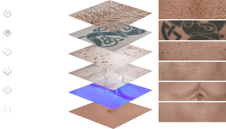 The skin is designed according to segments and follows the layering logic of real human skin from Skin Base to Body Hair. Through the intuitive workflow, apply and manage skin effects in every phase of the design process to achieve quality skin designs with a myriad of possible looks and styles.
