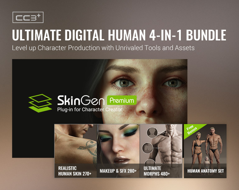 SkinGen is a major breakthrough in the digital human workflow that introduces an ultra-realistic dynamic material system dedicated to human skin synthesis. Embedded with industry leading scan-based assets, SkinGen not only makes CC3+ characters look great, it also enlivens existing projects with a significant visual upgrade.