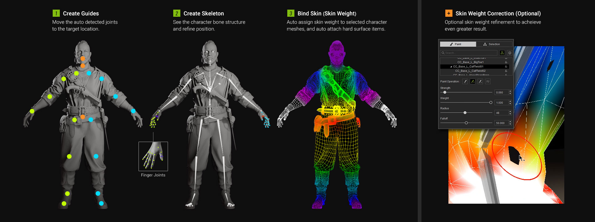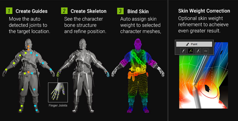 The animation quality of a rigged character is highly dependent on the proper skin-weight assignments related to its governing bones. AccuRIG mimics the weight-paint patterns of professional riggers for natural articulation of the body joints.