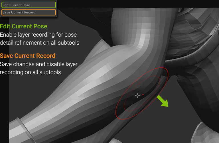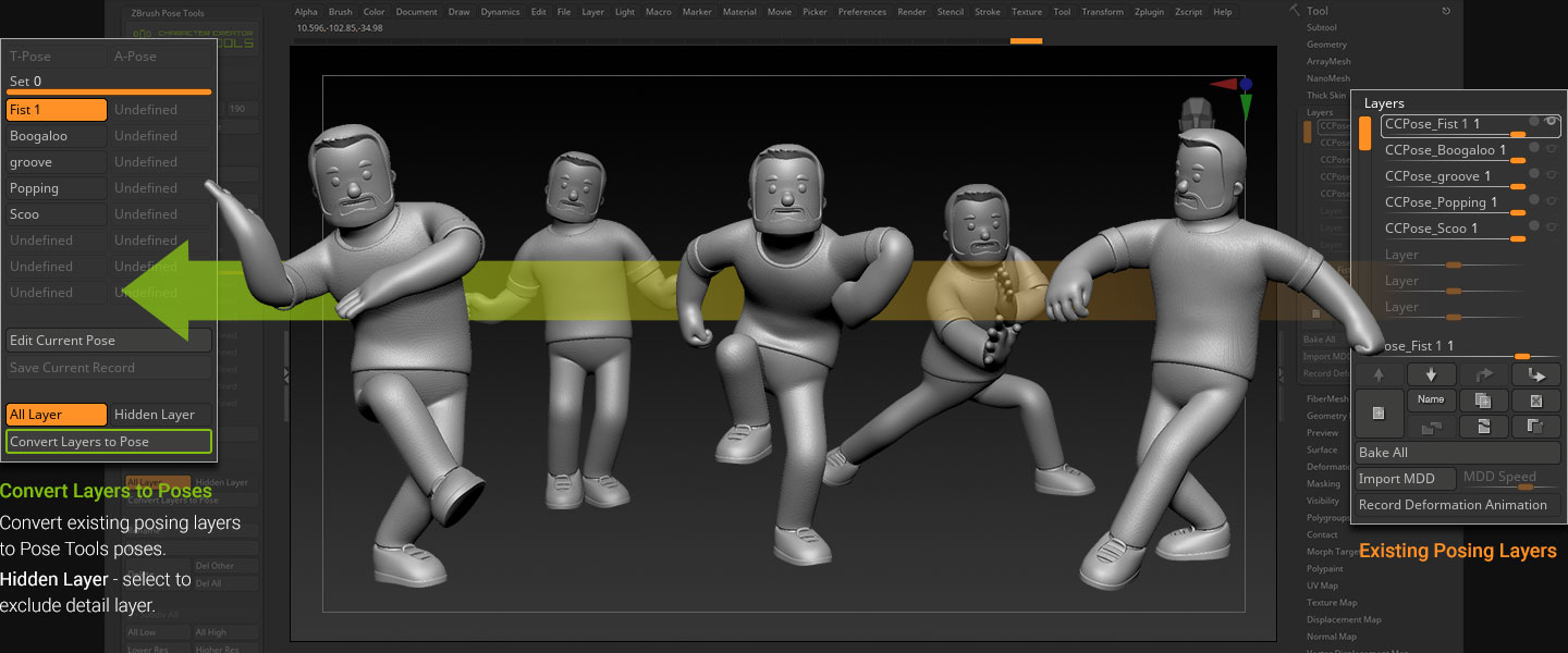 Serving as a macro to existing ZBrush features, Pose Tools seamlessly syncs up with ZBrush layers and their associated subtools.