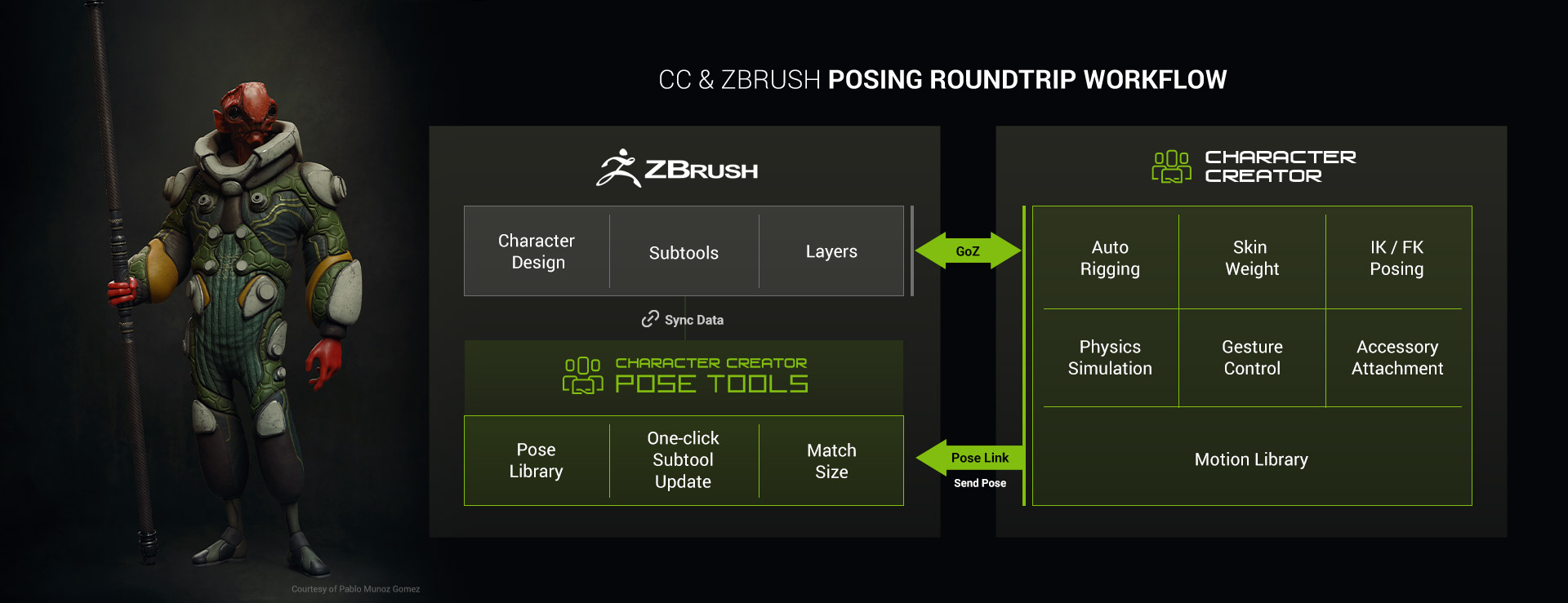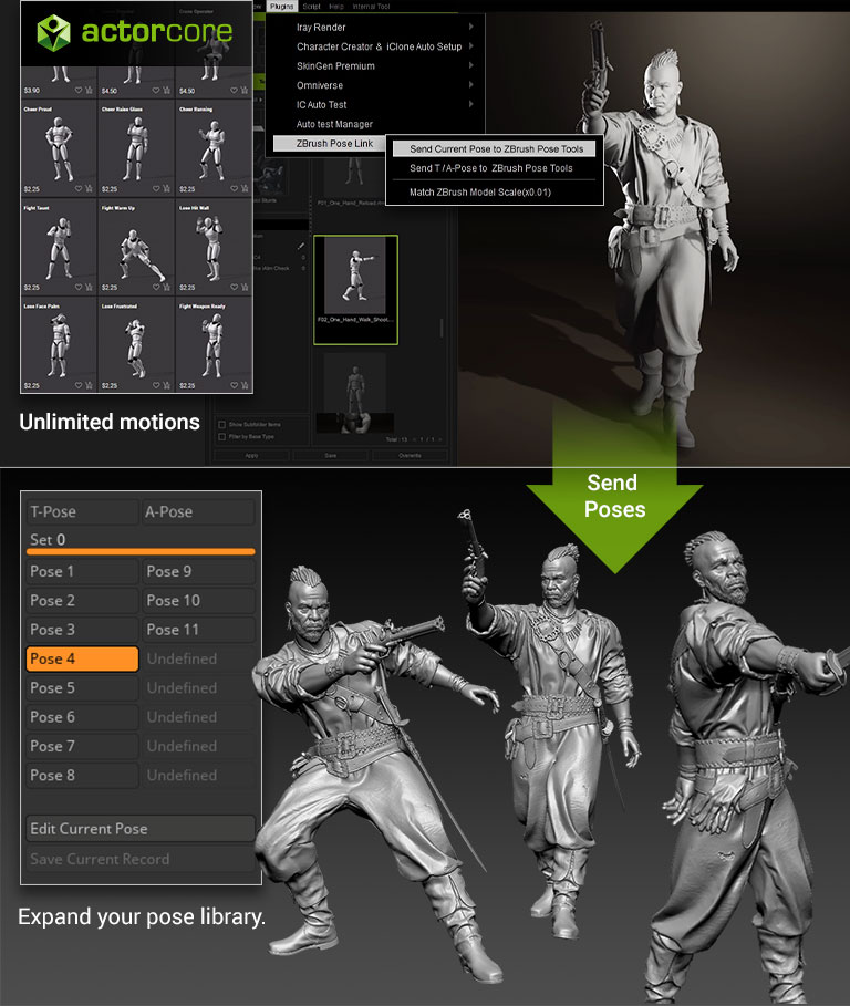 ZBrush Pose Link for Character Creator significantly amplifies the power of ZBrush Pose Tools, resulting in a powerful combo. When combined, the two plugins provide the following benefits: