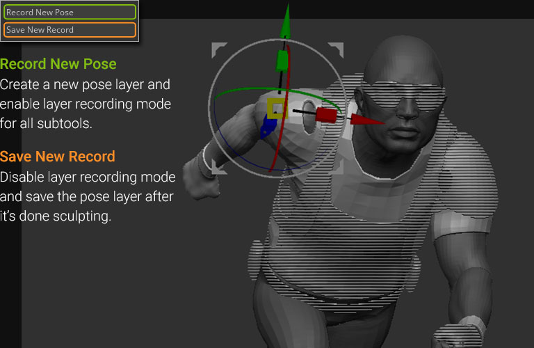 Create new poses with just one click to enable layer recording for all subtools involved. This feature integrates ZBrush mask posing and modifications from the Transpose Master.