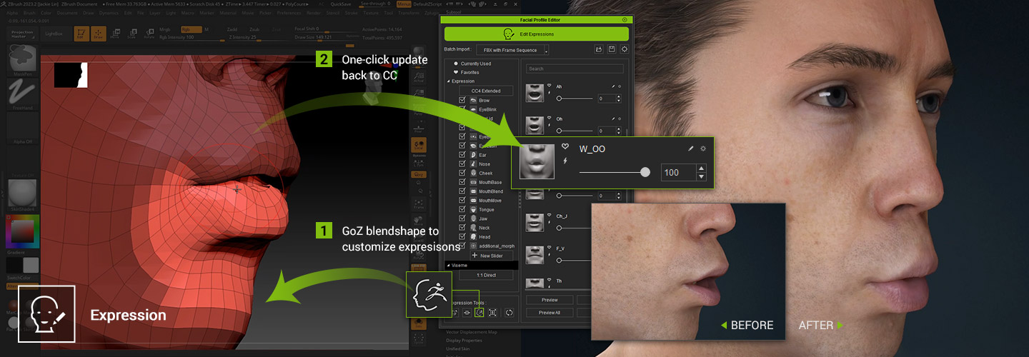 The seamless GoZ design loop positions ZBrush as an essential tool for crafting character designs and custom assets. Conversely, the streamlined sculpting workflow with Character Creator makes full-body modeling a breeze. Whether creating detailed clothing, shaping hard mesh accessories, or generating unique expression styles, the entire process becomes effortless with convenient single-click updates.