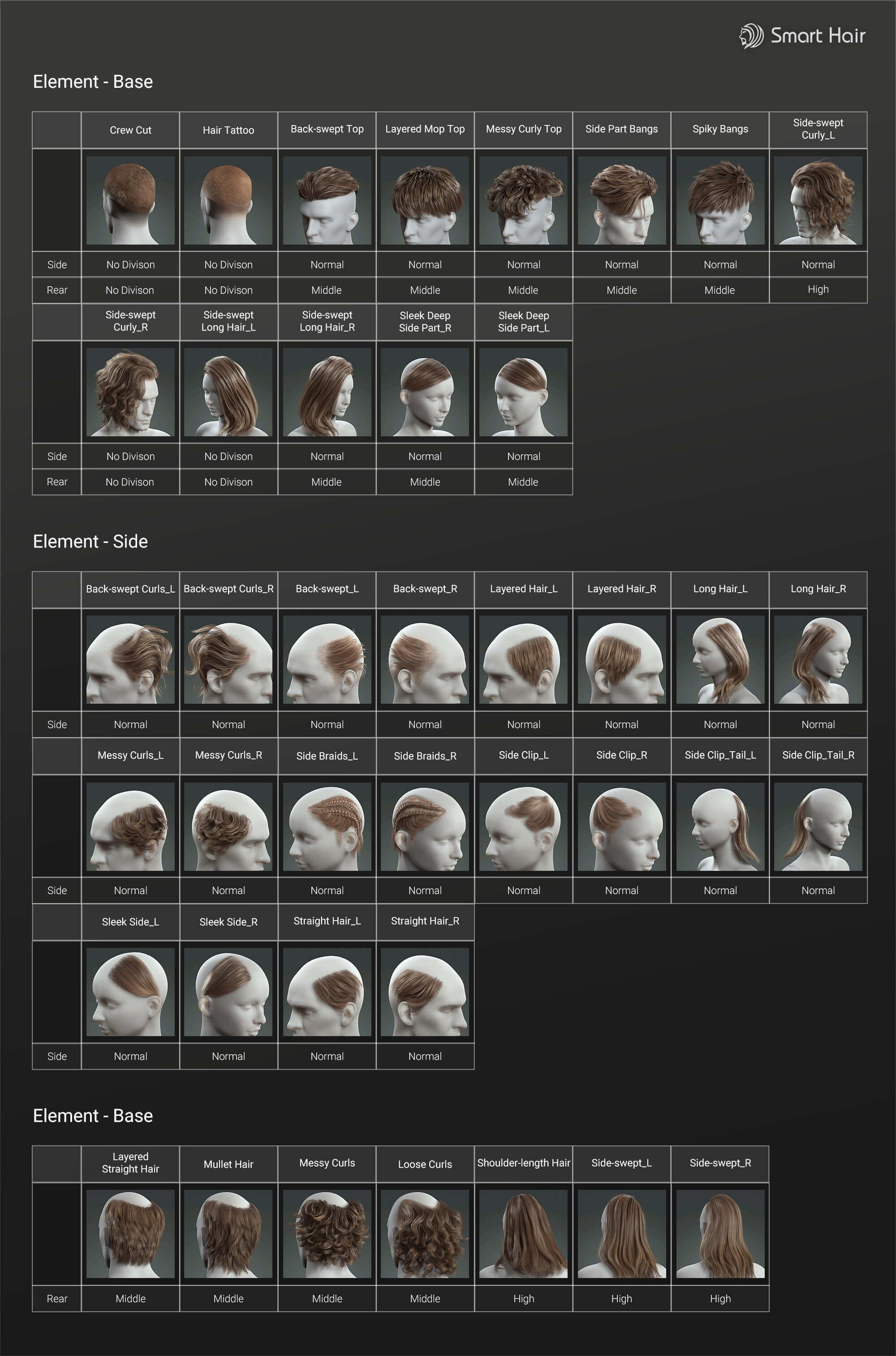 Not enough from the preset materials? Then take advantage of the powerful Smart Hair Shader which you can use to freely change the base color, root-end color, highlight styles, and reflection patterns.