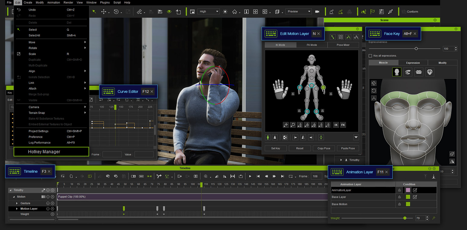 To make iClone more user driven, almost all iClone functions can custom map to user defined hotkeys, especially Windows compatible devices. This open design will fundamentally change the way people work with iClone, or Live Link animation to other 3D tools.