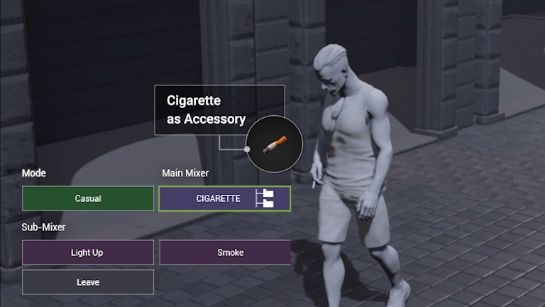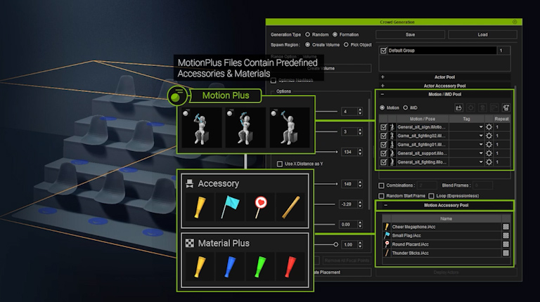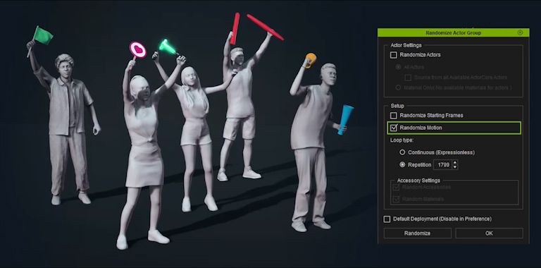 Flexible motion pairing for Smart Accessory is essential for spawning and orchestrating large virtual crowds. Automatic assignment of interactive props, along with distinct accessories such as hats, glasses, and handheld items helps to differentiate each individual.