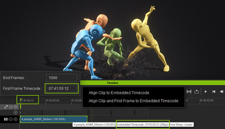 iClone Timecode enables a fully integrated timecode pipeline that powers synced mocap, matching frame rates, motion editing, and CGI with video compositing. The bidirectional FBX timecode exchange works seamlessly with other timecode-compatible software, including Maya, MotionBuilder, and Unreal Engine.