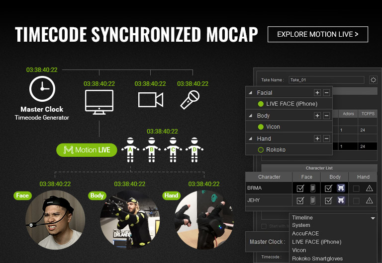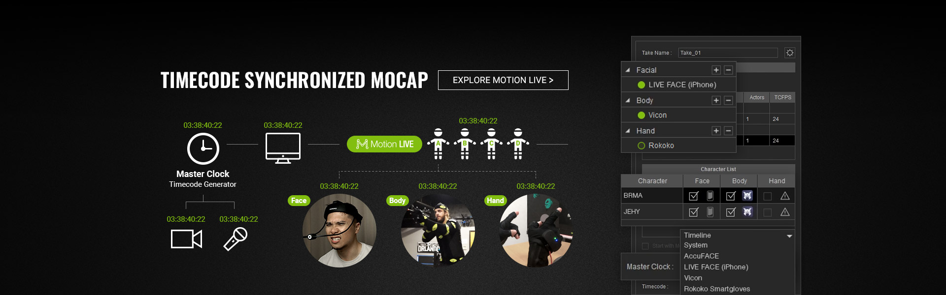 Motion LIVE for iClone is a complete full-body motion capture platform that streams motion data from top-tier mocap devices, tracking 3D character faces, hands, and bodies in real-time. With iClone Timecode, every recording source stays locked in sync for perfect harmony.